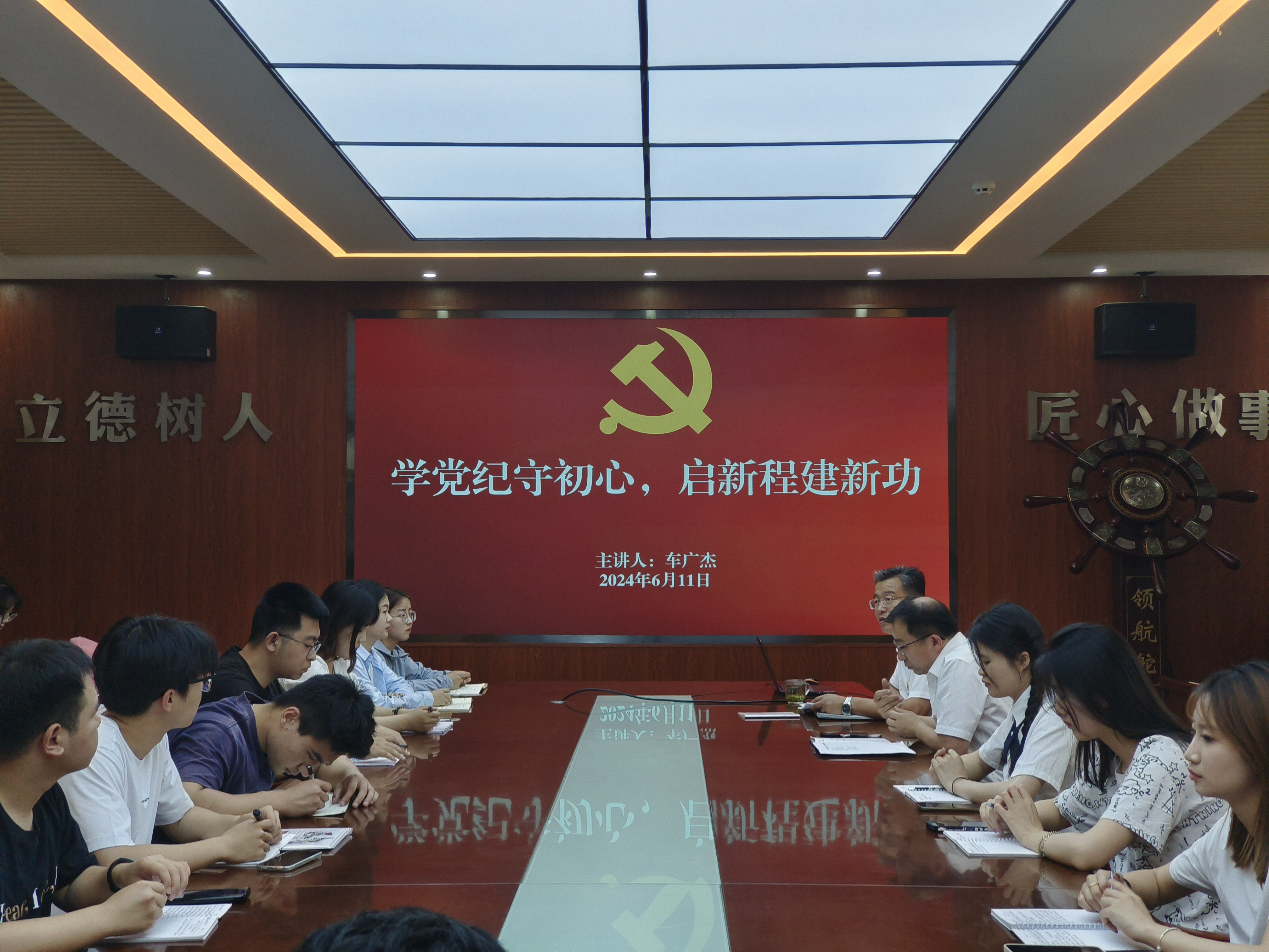 车广杰围绕学党纪、守初心、启新程、建新功四个方面向同学们进行了系统阐释,并提出了要求。一是要学习党规党纪,明确纪律,始终以高标准严格要求自己,以党纪作为行动的根本保障与指路明灯;二是要坚守自己的初心与信仰,要始终胸怀家国情怀,为国家、社会做贡献;三是无论身处何时何地,党员的身份不变、权利和义务不变、发挥模范先锋的作用不变,要始终保持本色,不忘初心;四是新的征程上要成为有理想、敢担当、能吃苦、肯奋斗的新时代好青年,在新的岗位上发光发热,大放异彩。