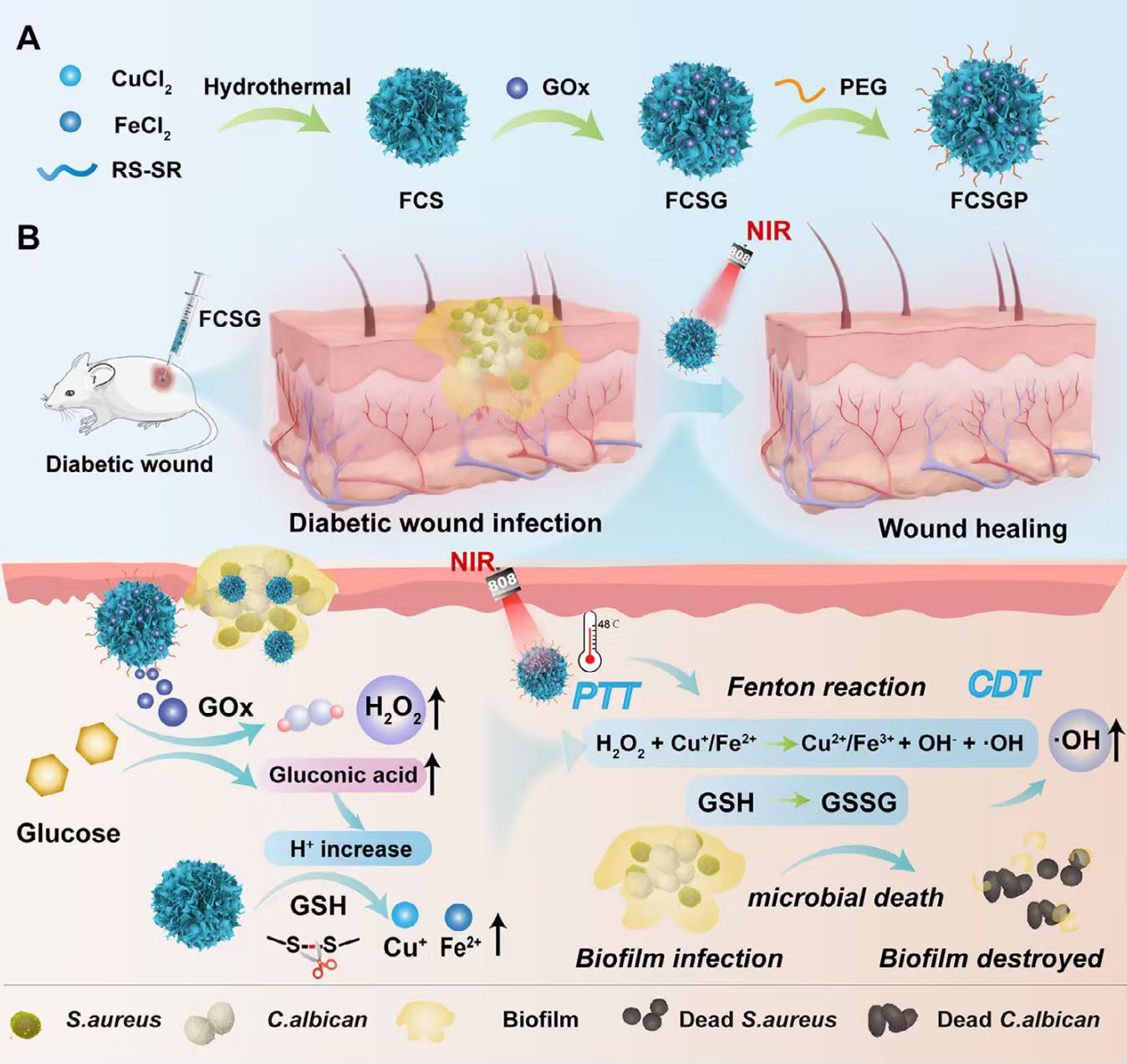 近日,永利yl23411集团官网山东省杰青谭玉龙教授团队在国际权威期刊《Small》(一区,TOP,IF=12.1)在线发表题为《Glucose-Activated Fe-Cu Dual-Ion Nanozyme Cascade Reactor with Photothermal Enhancement for Antimicrobial Therapy in Diabetic Wound Healing》的文章,设计了一种具有高抗菌效率和载药能力的葡萄糖激活纳米反应器(FCSGP NPs),以增强对致病微生物及其生物被膜的抑制效果。