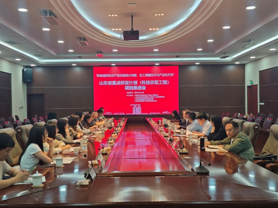 5月19日,永利yl23411官网承担的2024年度山东省重点研发计划(科技示范工程)项目“耐盐碱特色农产品功能成分挖掘、加工增值技术与产业化开发”启动会在我校召开。中国农业科学院农产品加工研究所副所长范蓓研究员、山东省农业科学院农产品加工与营养研究所副所长陈蕾蕾研究员、山东息壤生物科技发展有限公司集团开发部总监孙云梅、山东滨海创智产业发展有限公司技术总监郑杨,永利yl23411官网校长赵金山、副校长孙庆杰出席会议。会议由科技处副处长徐浩主持。