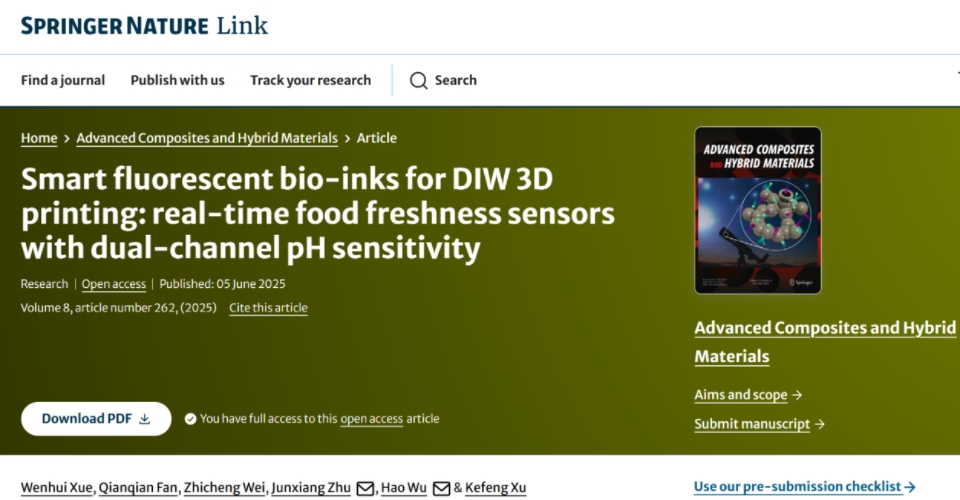 近日,永利yl23411集团官网吴昊教授课题组在国际权威期刊《Advanced Composites and Hybrid Materials》(中国科学院一区TOP期刊,影响因子23.2)发表了题为“Smart fluorescent bio-inks for DIW 3D printing: real-time food freshness sensors with dual-channel pH sensitivity”的重要研究论文。课题组基于直接墨水书写(DIW)三维打印技术,成功构建了一种具有双通道pH敏感性和可视化变色功能的实时食品新鲜度传感器,实现将多功能双通道荧光探针与先进3D打印技术深度融合应用于食品安全监测,为食品品质的非破坏性、实时监控提供了可持续创新解决方案。